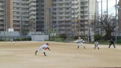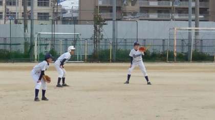 2回表、相手チームの攻撃をショートゴロの後連続三振を奪い、3者凡退で抑えました。1年生ピッチャーの力投が光ります。