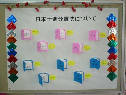 専門の知識をもった学校図書館補助員さんが週1回来てくださるので助言を受けながら左の写真のように室内掲示など整備を進めています。
