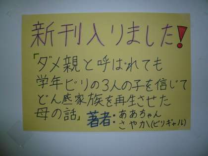 右の写真は職員室前の廊下に張り出された新刊の案内掲示で,これは,図書部の生徒たちが部活動で作成したものです。