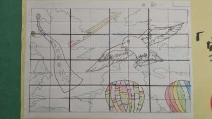 皆の作品を取り入れてリーダーの生徒が1つの作品にした、ということで「陸・海・空・宇宙」それぞれ1作品ずつに仕上がっています。写真2枚目は「陸」、3枚目は「海」です。