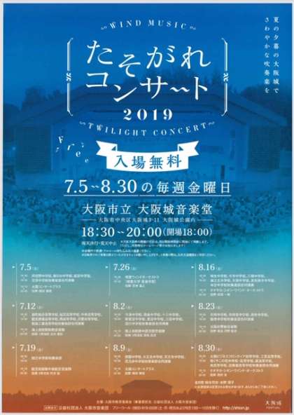 今年のたそがれコンサートは、7月5日(土)〜8月30日(土)の毎週金曜日午後6時30分〜8時に大阪城野外音楽堂で開催されます。