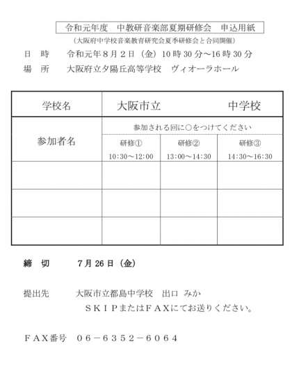 中教研音楽部では、大阪府中学校音楽研究会と合同で夏期研修会を開催いたします。