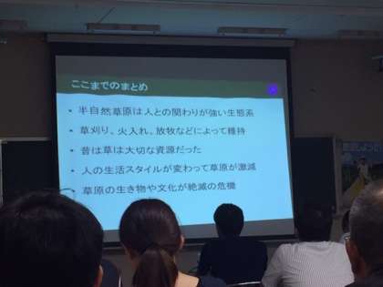 自然史博物館内の見学を行い、その後、植物園のフィールドワークの予定でしたが、あいにくの雨天のため、研修室で学芸員の方から「草原」について講義をしていただきました。理科授業に役立つヒントとなる内容で、有意義な時間となりました。
