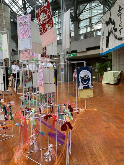 そして、展覧会の初日に開催された美術部合同ワークショップにも多くの美術部員の参加がありました。今回のワークショップのテーマは「むすぶ」。この言葉には「実を結ぶ」「完結」などの意味があり、参加者たちは紐で描いた自画像に叶えたい夢や希望を込めながら仕上げていきました。出来上がった作品は各自で展示用の柱にしっかりと結び付けられ大きな一つの作品として完成しました。この作品は、会期中の咲くやこの花館のステージを華やかに飾りました。