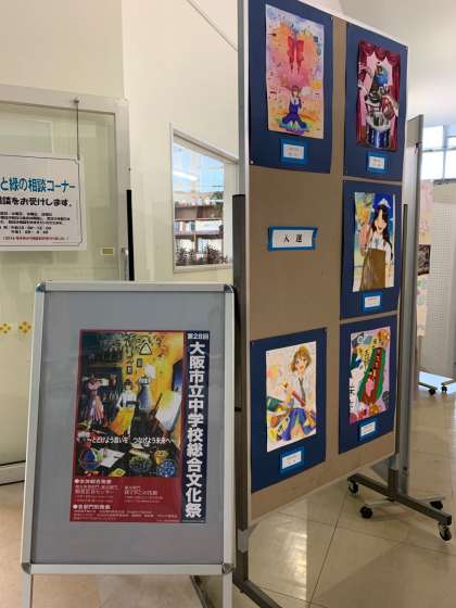 令和元年10月19日から27日の9日間にわたって鶴見区にある咲くやこの花館にて、大阪市立中学校総合文化祭「美術部展」が開催されました。大阪市立中学校の美術部24校414名の生徒の作品が集まりました。横断幕のような大きな作品から、手のひらサイズの小さく繊細な作品まで、個性豊かな作品が揃いました。