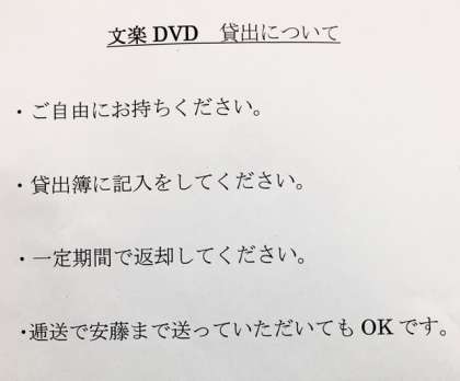 研究に伴い、大阪市立中学校音楽部の先生方に、文楽DVD貸し出し始めます。