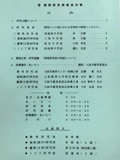 今年度は、新型コロナウイルス感染症拡大防止対策として、4つの部門(研究班)ごとに会場を設定し分散開催としました。子どもたちの学びを止めない、私たちの学びを止めないの合言葉の下、合計100名の音楽科教員が集い研究会を持ちました。今年度から「合唱研究班」「器楽(創作)研究班」「鑑賞(文楽)研究班」「ICT研究班」を立ち上げ研究を推進します。
