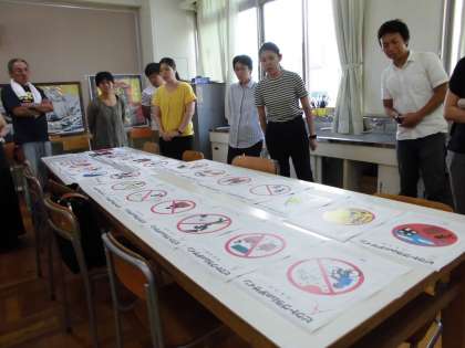 住之江中学校の浅地哲也先生に、実際に授業で生徒が制作した作品を持ってきていただき、グループごとに作品の評価をしてみて、その後全体で共有しました。同じ作品でも教員によって評価が分かれるものがあり、何を重視して評価するのかなど考えさせられることが多く、とても興味深い研修でした。